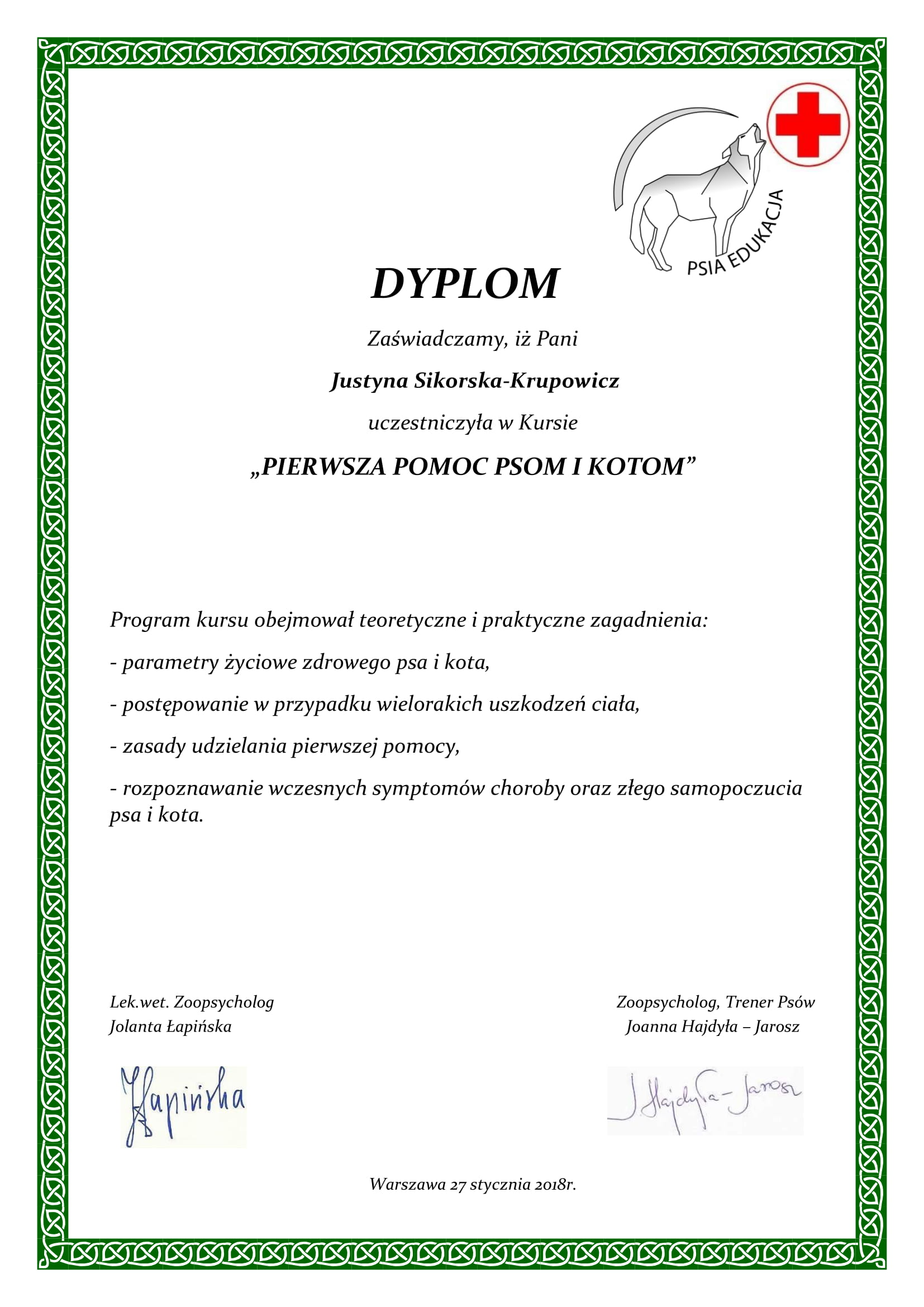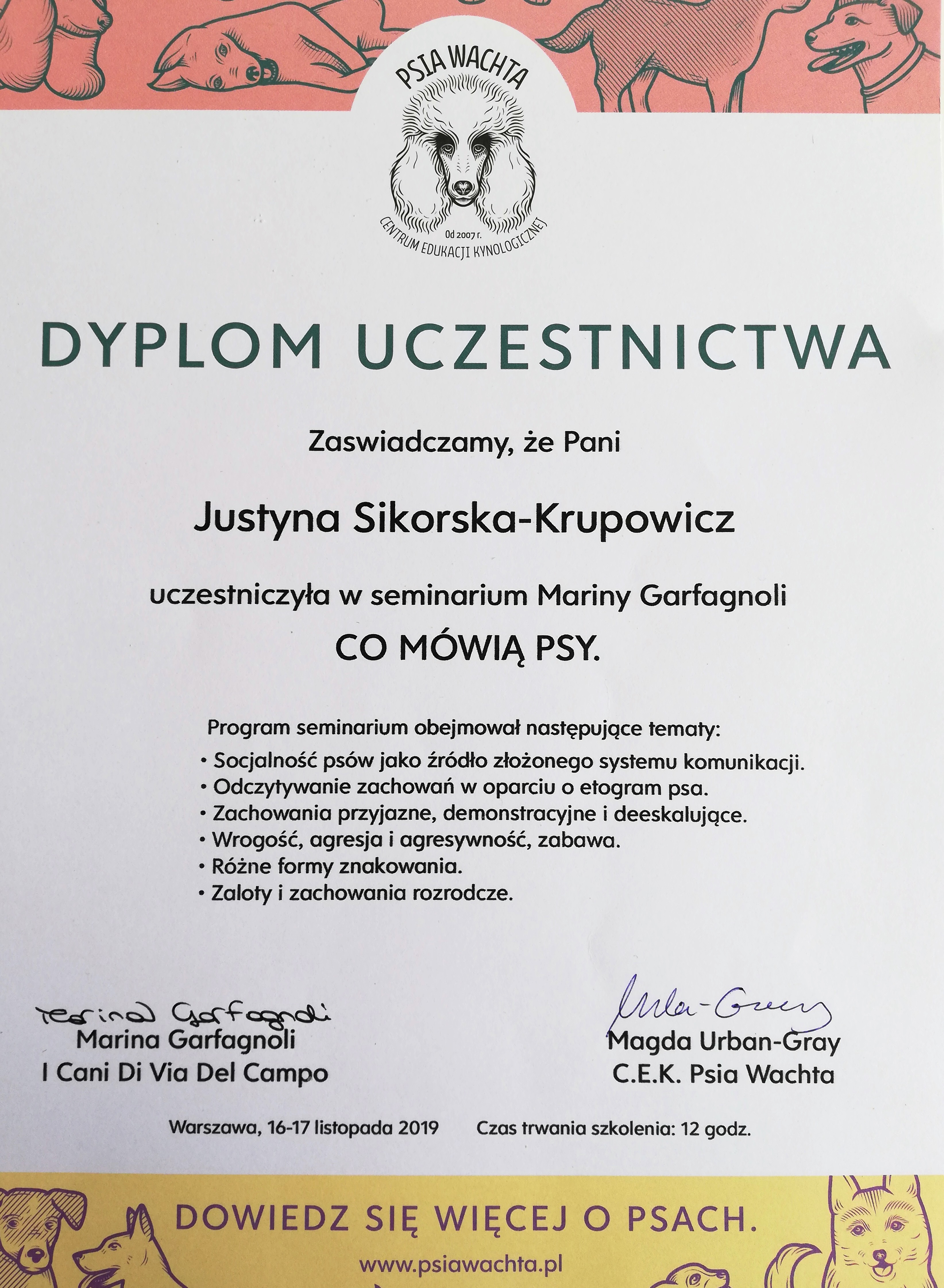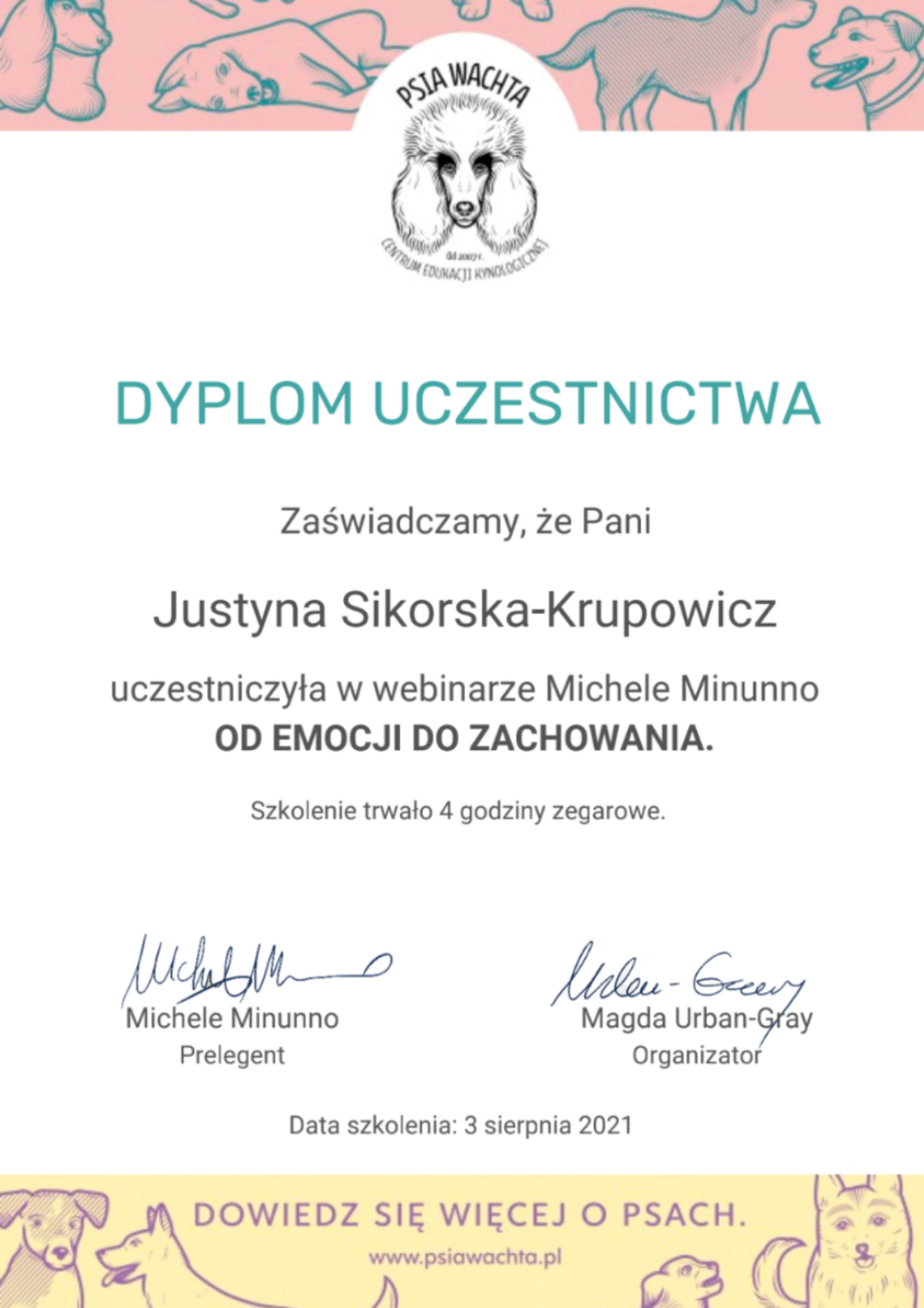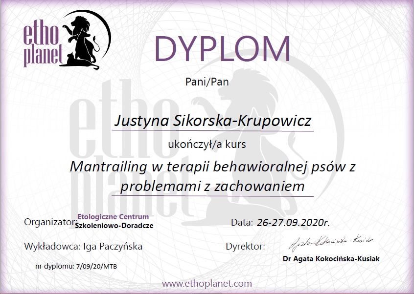 lipiec 2017 – ukończenie rocznych studiów podyplomowych na kierunku „Zoopsychologia – problemy behawioru psów” (Wydział Nauk o Zwierzętach – Szkoła Główna Gospodarstwa Wiejskiego w Warszawie).