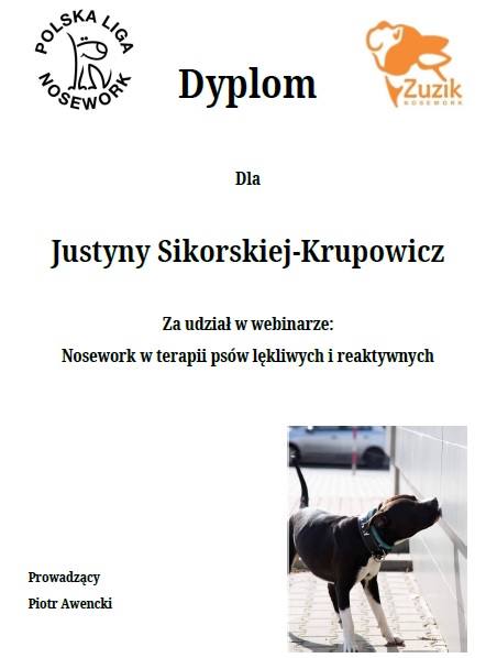 listopad 2020 – webinarium „nosework w terapii psów lękliwych i reaktywnych” – Piotr Awencki (Zuzik)